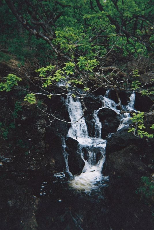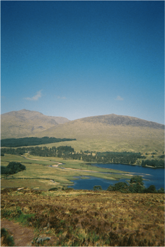 I also enacted a logic of slowness through my decision to document the way with analogue photography. Developing these photographs a couple of weeks afterwards, I enabled my empiric memories to solidify before they could be shaped by their digital counterparts. Further, by writing about my experiences in this way, I am embracing a slow form of discourse, each word carefully chosen and placed, one foot in front of the other, often stopping to look back and reflect. Writing and walking can be understood as reciprocal practices, with a long tradition of literature that blends the two. An involuntary skip, the words cascade onto the page in a narrative flurry, a waterfall up ahead, the words toppling atop of each other, bit by bit, syllable by ebbing syllable. Letters trip upon the next, little by little, as I stumble on a root. Emerging from the woodland, the pace becomes languid and the body opens, the chin lifting to the Scottish sky. The words reflect the way we walk with such transcendence.