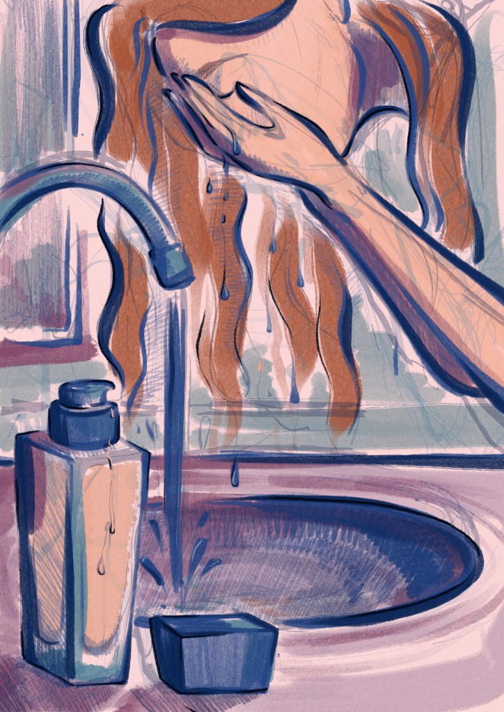 I pick up the bottle. The glass is cool in my hand, vaguely my skin tone, with a blue plastic cap. I wonder what is inside. What are the 50 chemicals on the barely legible ingredients sticker that I am putting on my face (and washing down the sink)?