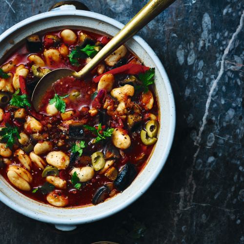 Chop up the pumpkin, aubergine and sweet potato and toss with olive oil and herbs de provence. Roast in the oven for around 20-25 minutes.