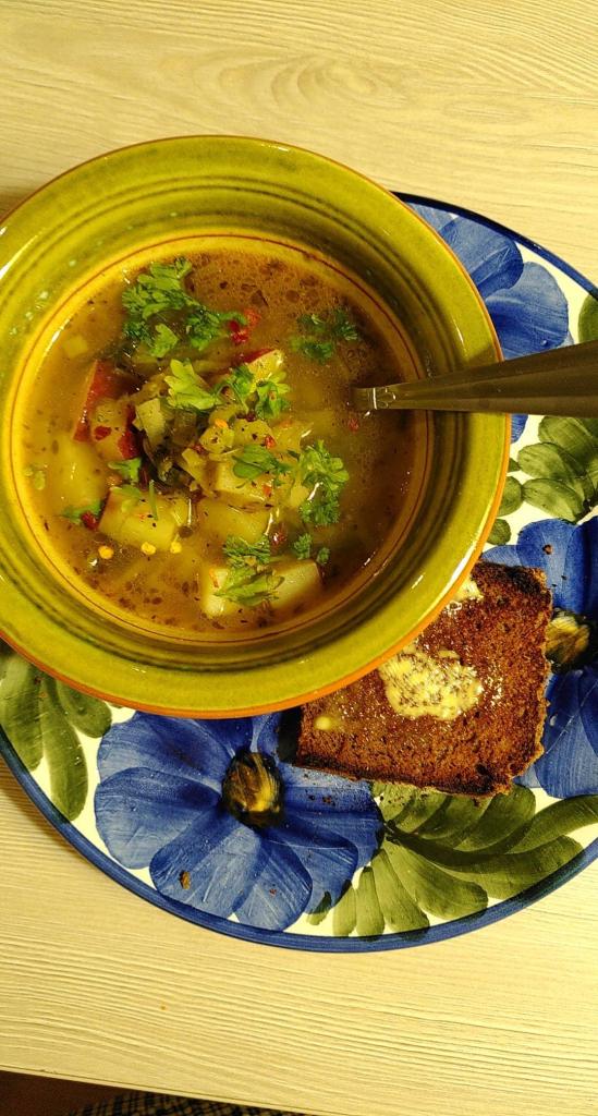 You can eat it as it is, or you can blend the soup and boil it once again, this time adding a plant-based cream (eg. soya cream) to make the soup creamy. Serve hot and garnish with some fresh herbs and more spices and with toasted bread on the side!