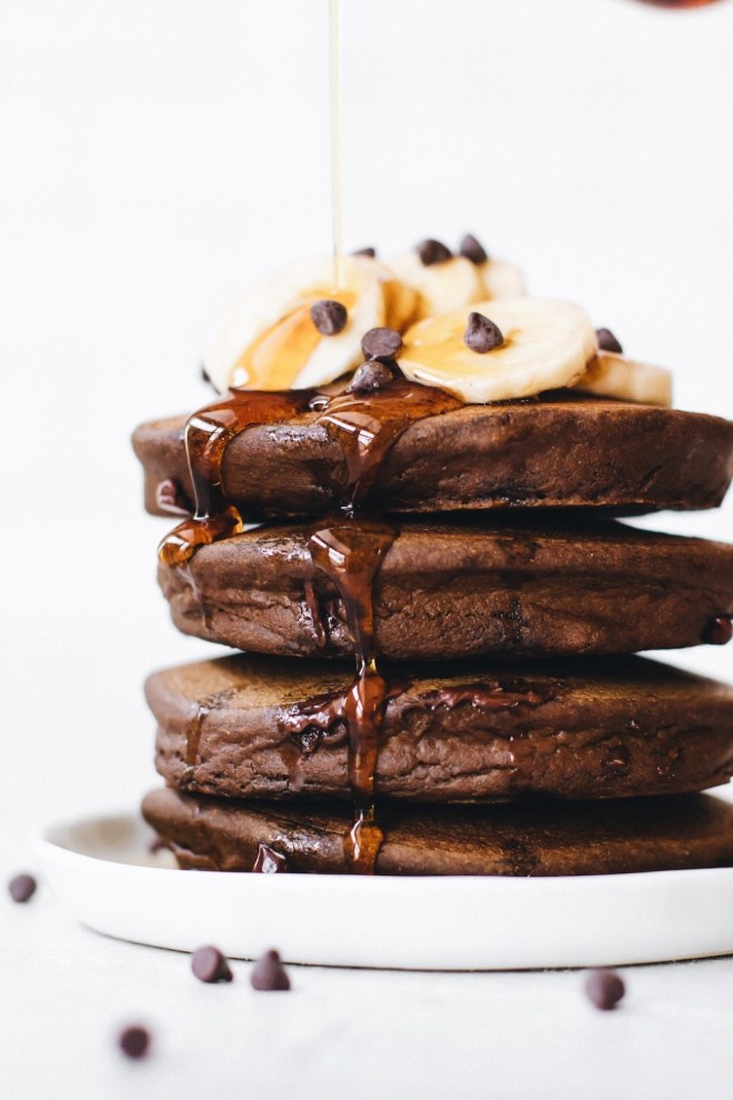 Use 2-3 tablespoons of batter for each pancake; and let them cook for several minutes. They’re pretty small pancakes, but because they don’t have any egg in them it’s better to keep them small so that they stay in tact easier when flipping them. Here you can add any topping. I like vegan chocolate chips, which you can find in free from aisles at the grocery store. Just be sure to use a knife to cover the toppings with a bit more pancake batter so that they don’t burn when flipped.