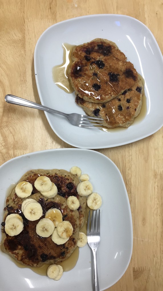 Blend all the ingredients together and let sit for 10-30 minutes to thicken. Warm up a large pan on medium-low heat (like a 3/8) for about ten minutes (this is important, as too hot a pan will burn the batter on the bottom and not cook it through, while a pan too cold will not cook the pancake!) before spreading some vegan butter onto the pan, coating it evenly.